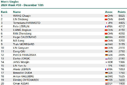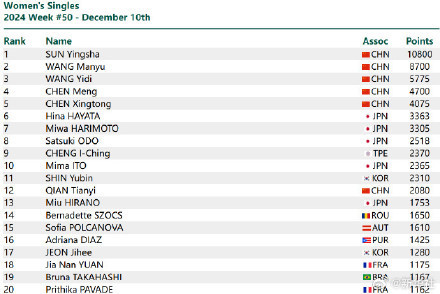 10日,国际乒联2024年第50周世界排名公布。男单方面,王楚钦保持世界排名第一,林诗栋排名第二。女单方面,孙颖莎持续霸榜第一,王曼昱 、王艺迪位列第二、第三。